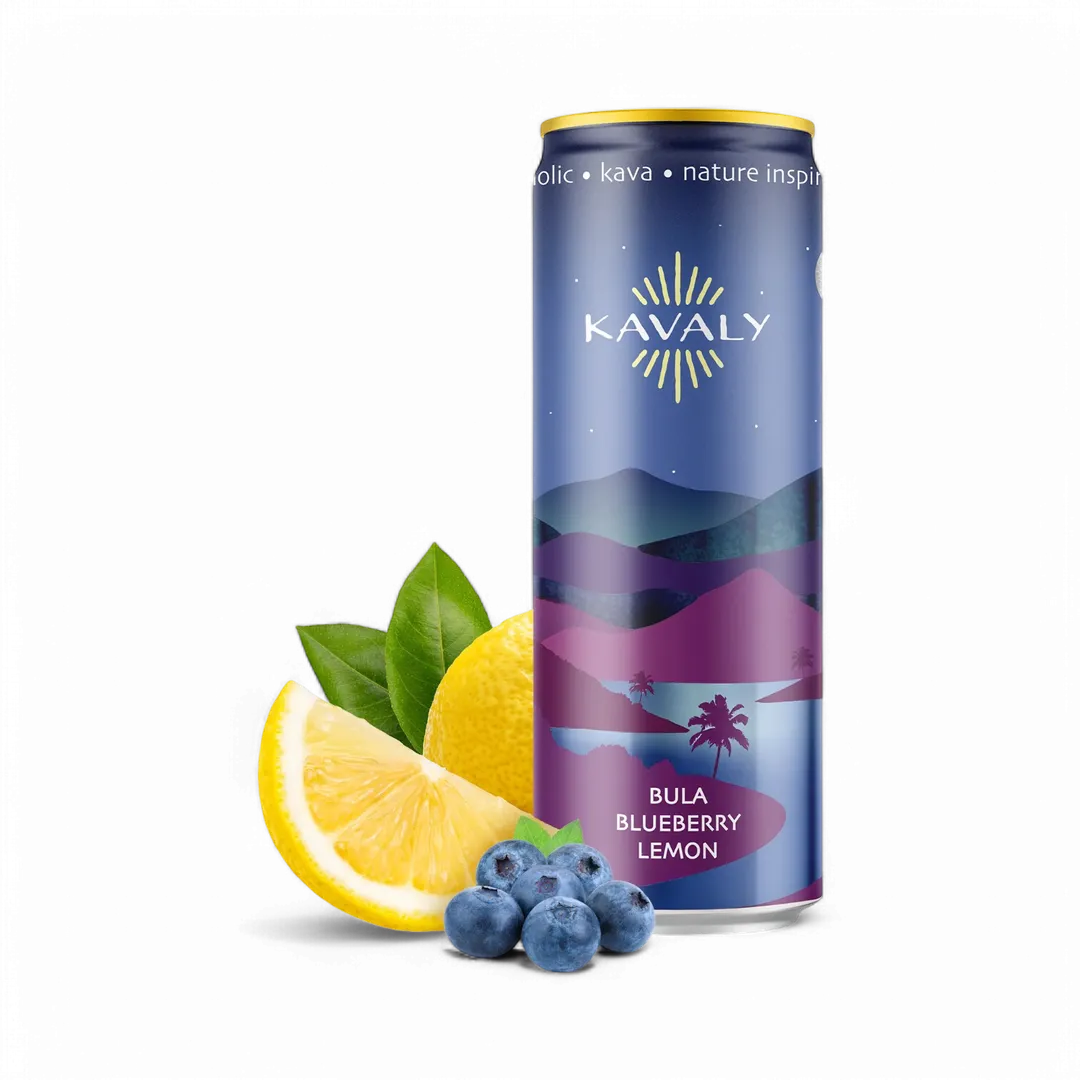 Original Kavaly Blueberry Lemon 12oz Sparkling Kava Beverage. Each can has 500mg of kava extract brewed to perfection with the taste of a delicious low sugar soda. There is a new way to relax - Kavaly is here.