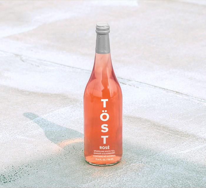 TÖST ROSÉ bottles are all-natural, delicious, dry, sparkling non-alcoholic beverages with white tea, ginger and elderberry.